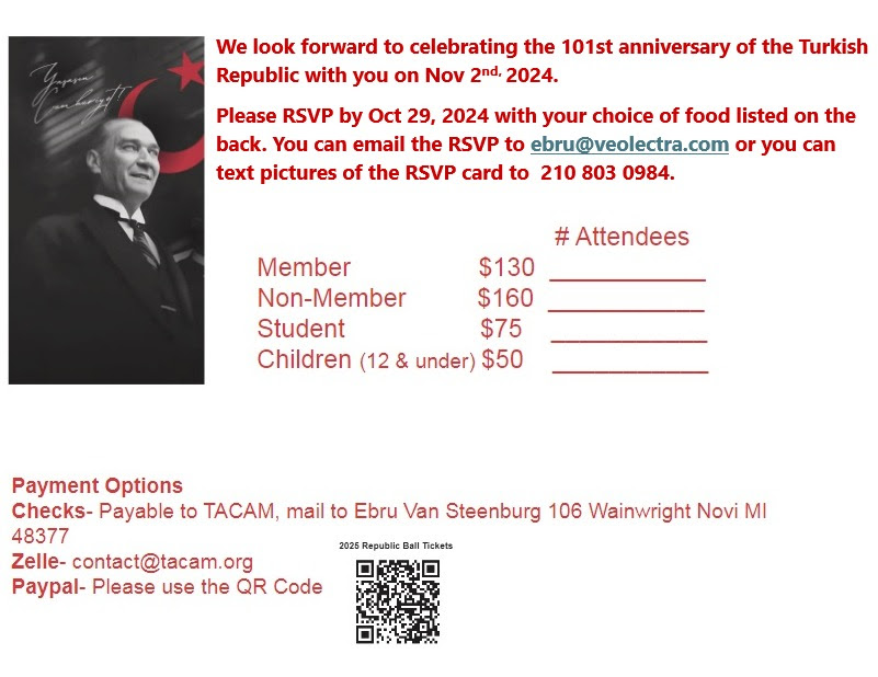 We look forward to celebrating the 101st anniversary of the Turkish Republic with you on Nov 2nd, 2024. Please RSVP by Oct 29, 2024, with your choice of food listed on the back of the RSVP card. You can email the RSVP to ebru@veolectra.com or you can text pictures of the RSVP card to (210) 803 0984.